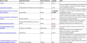 The following compilation was developed by Latin American regional coordinator Maria Reyes. It lists resources from multiple sources, some regionally-focused and some globally relevant, and some available in many languages. Resources address areas relevant to security ranging from physical, to digital, to financial security, to wellbeing, among others. We encourage readers to check out the risk assessment template, which combines much of the insight from several resources listed here.